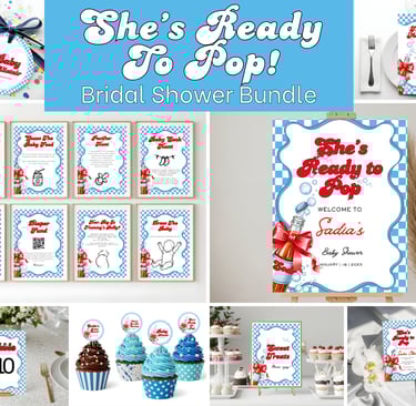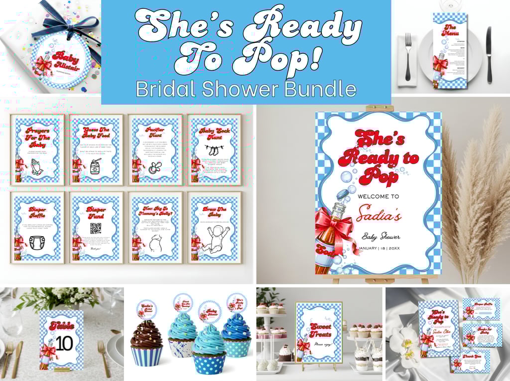 Red gingham backgrounds, bubbly graphics, and classic soda bottle illustrations make this color scheme a favorite for hosts who want their She’s Ready to Pop baby shower to feel lively and nostalgic.